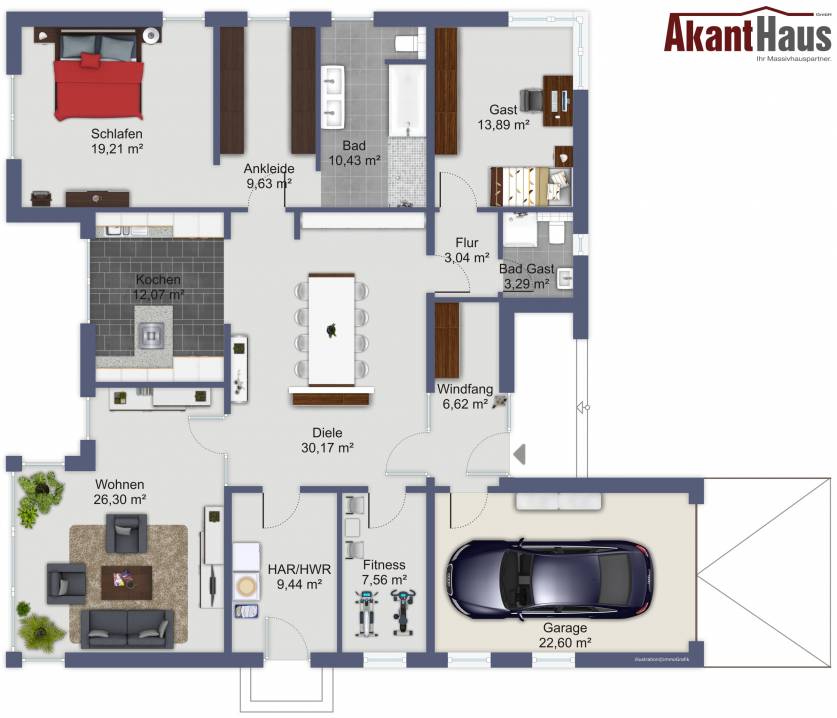 Mit nur einem Schritt sind Sie auf Ihrer Terrasse und können bei Sonnenschein den Tag mit einem gemütlichen Frühstück im Freien beginnen. In der Mitte des Hauses befindet sich eine 30 m² große Diele, die nicht nur als Essbereich sondern auch als Treffpunkt für alle Familienmitglieder im Haus wie geschaffen ist.