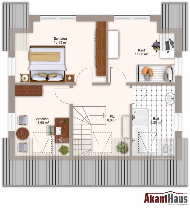 Unser 1,5 Geschosser bietet in der 4- Raum Variante die größtmögliche Wohnqualität auf geringer Grundfläche. Lassen Sie durch die bodentiefen Fenster die Sonne in Ihr Haus und genießen Sie die hellen und großzügig geschnittenen Räume. Das Vollbad mit seiner hochwertigen Sanitärausstattung lädt zum Entspannen und Träumen ein.