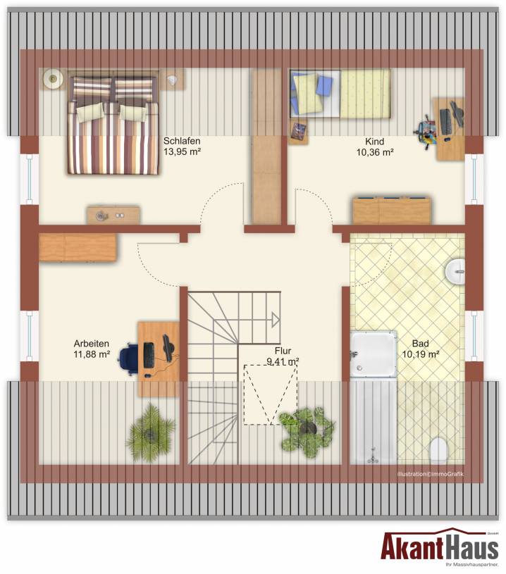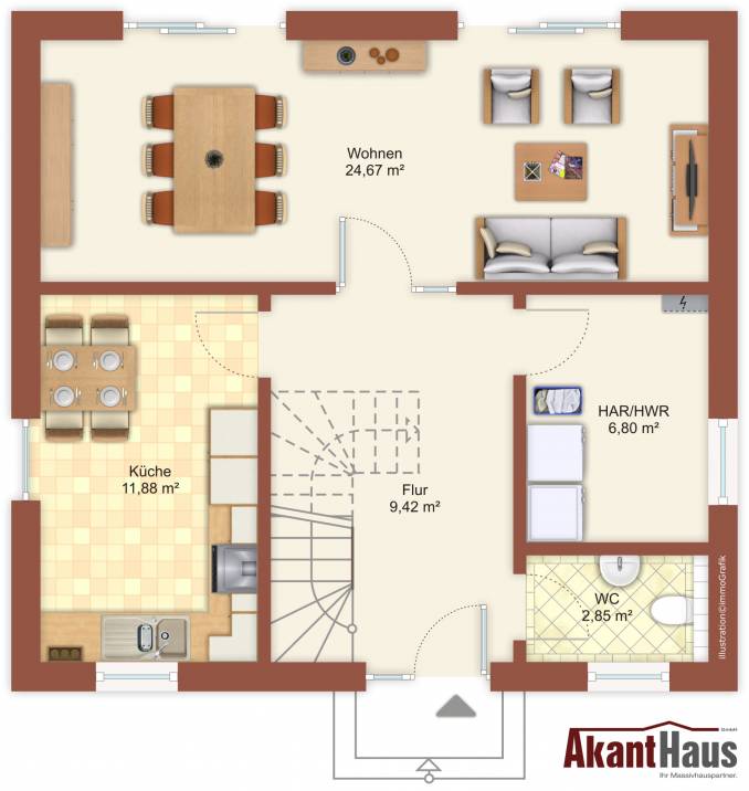 Auf 110 m² Nutzfläche findet jedes Familienmitglied genügend Raum und Platz zur persönlichen Entfaltung. Durch die großzügigen Fensterfronten entstehen im Haus angenehme Lichtverhältnisse und lassen Wohnqualität zu Lebensqualität werden.