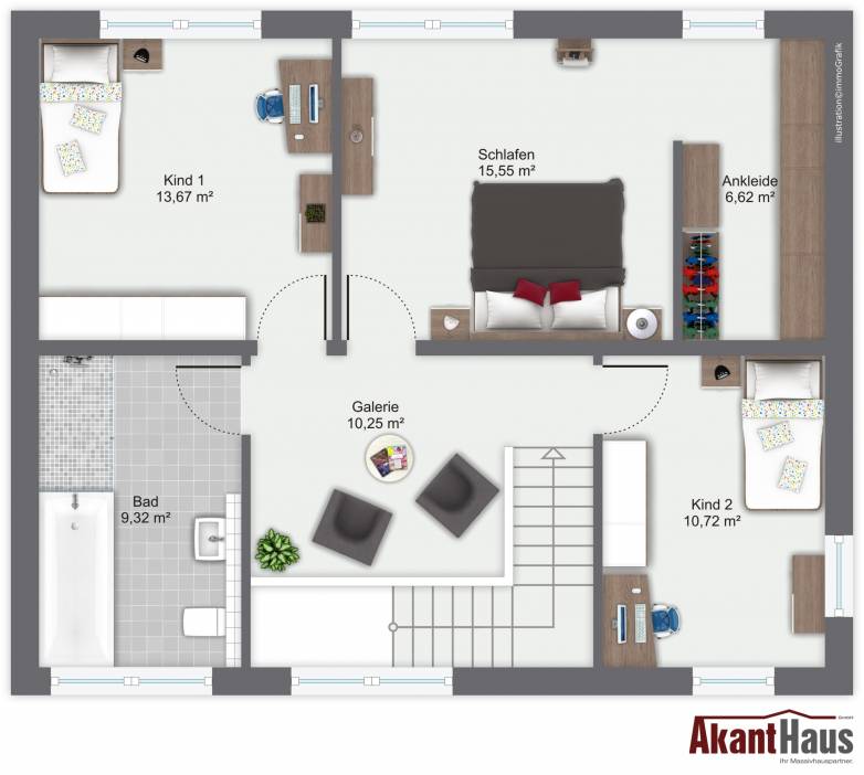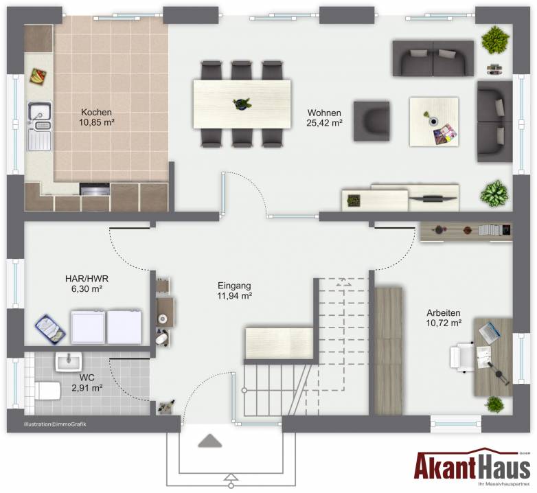 Genießen Sie Ihr Familienleben in einem offenen Wohn- und Essbereich mit angrenzender Küche und entfalten Sie Ihre Persönlichkeit im vollwertigen Dachgeschoss ohne Dachschrägen.